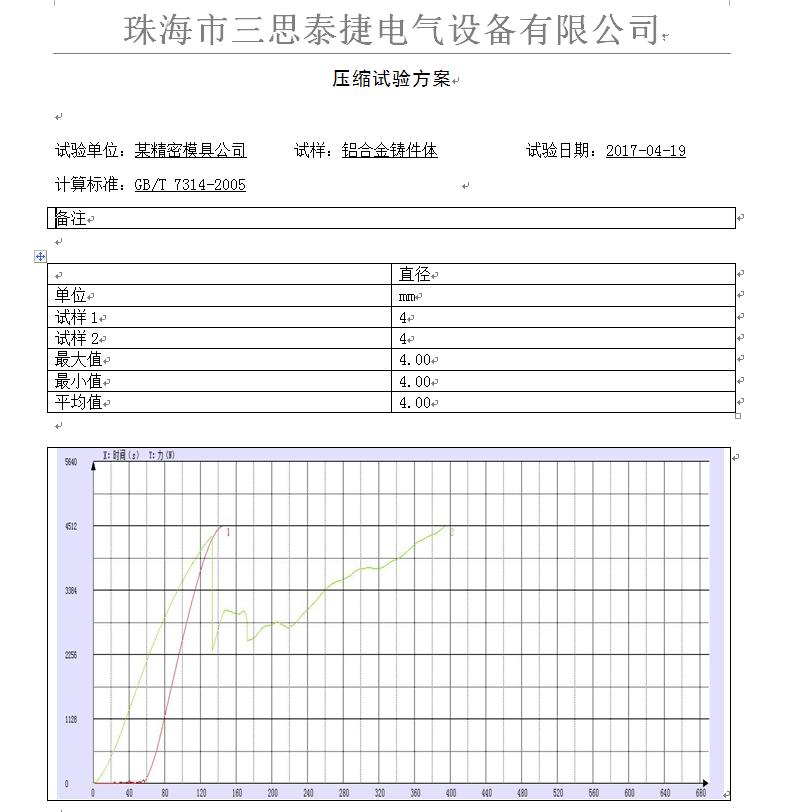 試驗單位:某精密模具公司試樣:鋁合金鑄件體試驗日期:2016-04-19計算標準:GB/T 7314-2005測試項目:壓縮試驗試驗設備:三思泰捷CMT4304試驗機客戶背景:該公司是一家大型汽配企業(yè),從事鋅、鋁、鎂等合金壓鑄,提供模具設計、模具制作,壓鑄成型,機械加工,表面涂裝,電鍍,組裝等業(yè)務,客戶購置了三思泰捷電子萬能試驗機從事材料及結構件的測試試驗工作。